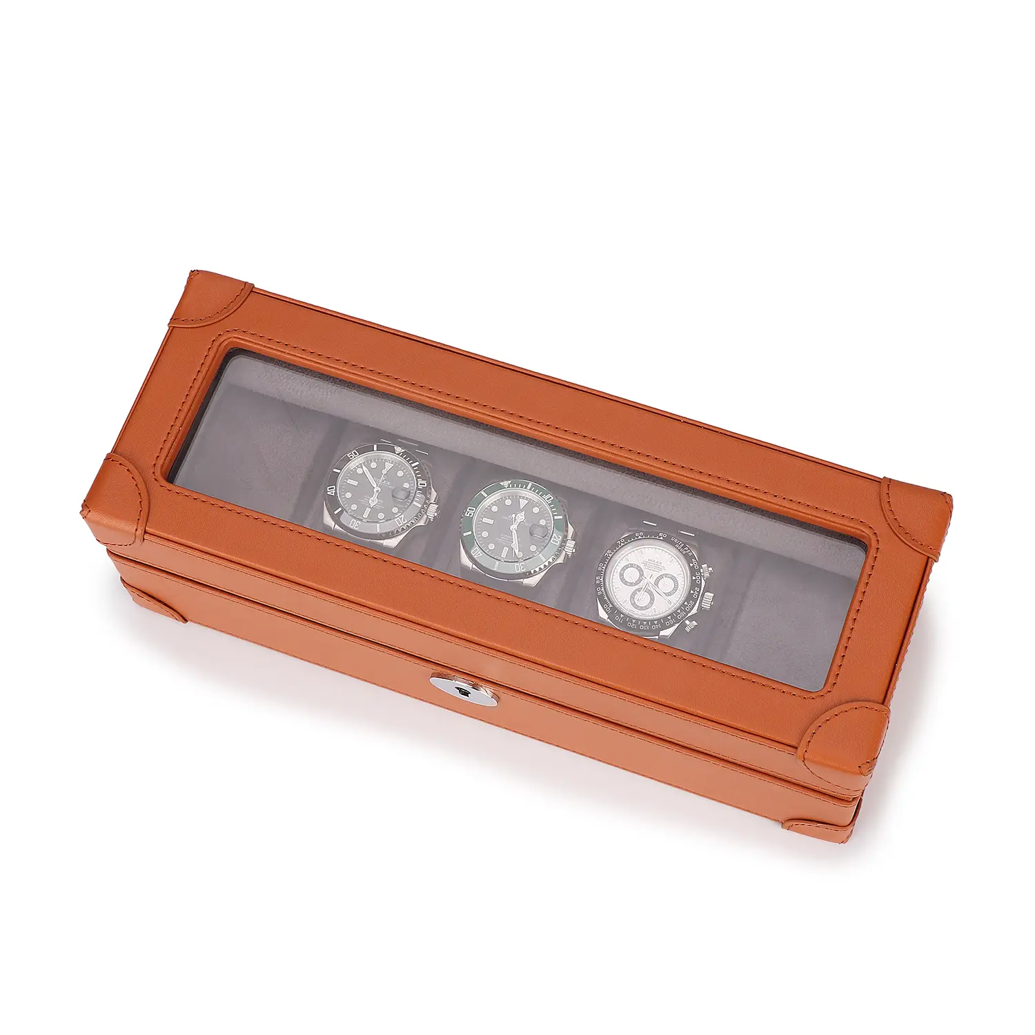 Securely store your branded watches with this window 5-watch box, which can neatly align up to 5 watches. Keep your timepieces organized and safe in individual slots, ensuring they are stored securely and ready for wear.
